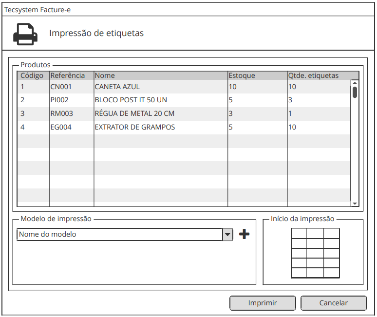 O sistema exibe a lista de produtos e a quantidade em estoque, e uma coluna com a quantidade de etiquetas que serão impressas para cada produto (inicialmente, a mesma quantidade em estoque);