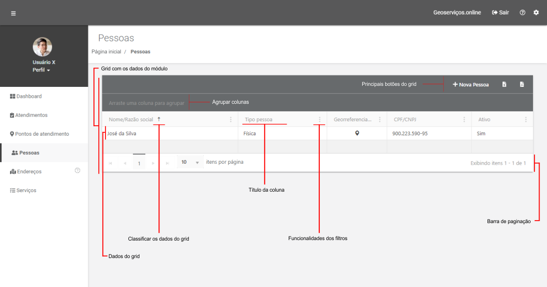 O grid principal de cada módulo deve conter algumas funcionalidades específicas para facilitar o trabalho do dia a dia do usuário, sendo elas as seguintes:
