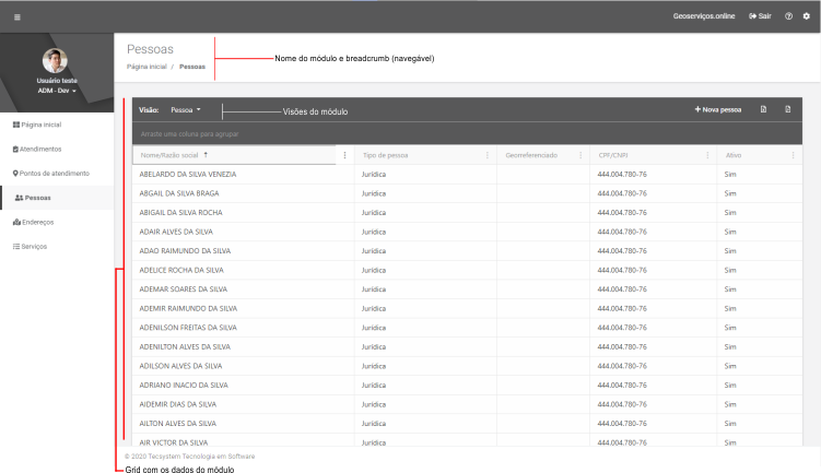 Por padrão, todas as páginas iniciais de cada módulo deve conter algumas características em comum, sendo estas o nome do módulo que está sendo acessado, com o nome do módulo em destaque no canto superior direito da página e logo a baixo com uma uma fonte menor o breadcrumb (barra de navegação) que orientará o usuário em qual parte do cadastro ele se encontra dentro da página do módulo, sendo essa barra de navegação navegável, possibilitando o usuário navegar entre as páginas de cadastro. O usuário também poderá contar em alguns módulos, com um botão no canto esquerdo do grid, para selecionar a visão do módulo. O botão de visão deve aparecer apenas no cadastro de pessoas, pontos de atendimentos e atendimentos. Ao acessar o módulo, caso tenha muitas informações e o sistema demore carregar os dados cadastrados, o sistema deve exibir um load do tipo “Fading circle”, para mostrar ao usuário que os dados estão sendo carregados.