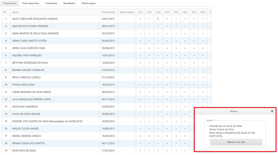 2. Se o professor marcar o aviso como lido o mesmo irá ser removido da tela;