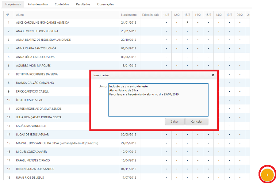 4. Se clicar em salvar o aviso será salvo e a janela fechada;