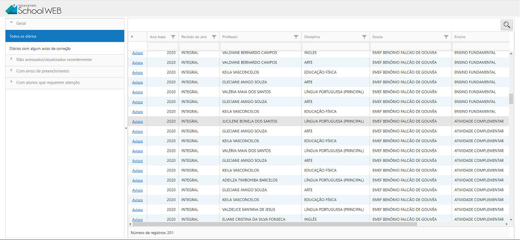 Essa funcionalidade possui o objetivo de mostrar para o gestor diários que possuem irregularidades ou que não estão sendo acessados, evitando que o mesmo acesse os diários individualmente.