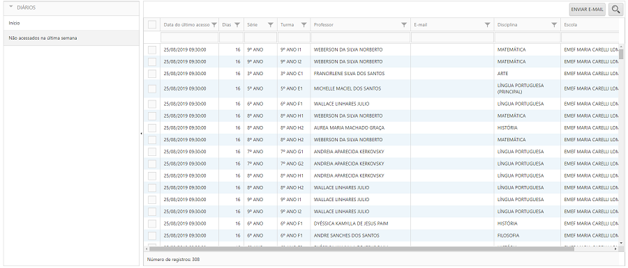 A segunda opção do módulo é a “Não acessados na última semana”. Nesta tela serão exibidos todos os diários que não foram acessados na última semana, para isso o sistema está gravando quando o diário é acessado(somente acessos dos professores são armazenados). Além disso, também é possível enviar um e-mail para todos os diário selecionados no grid alertando sobre o acesso ao diário.