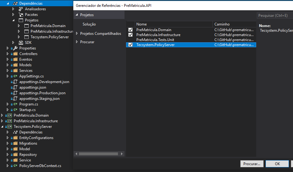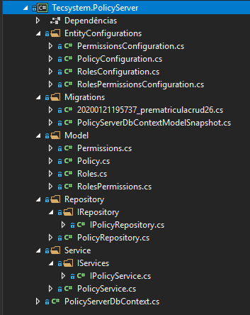 • Nas dependências do projeto adicione o projeto Tecsystem.PolicyServer.