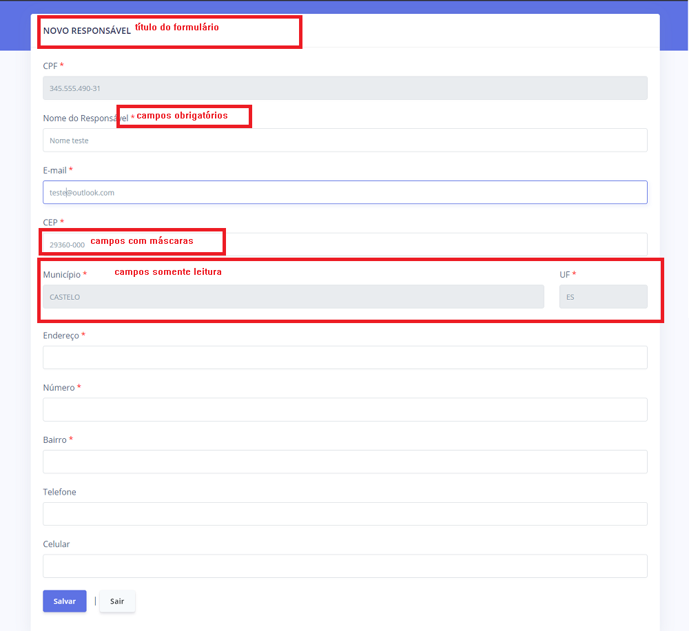 • Os campos formatados devem contar com máscaras para auxiliar no preenchimento. (Ex.: Data, Telefone, CPF, CEP, etc);