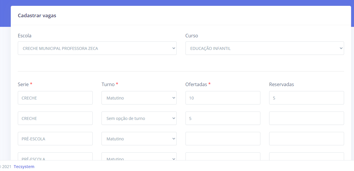 O sistema permite que várias vagas sejam cadastradas ao mesmo tempo nessa página, basta que possuam séries e turno diferentes.