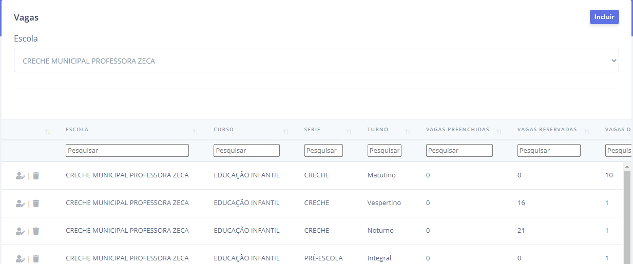 Lembrando que se já existirem pré-matrículas vinculadas a essa vaga o sistema não irá permitir a exclusão.
